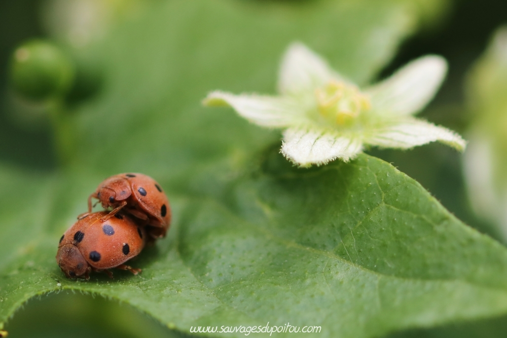 Bien que la Bryone dioïque soit toxique pour nombre d’espèces, la Coccinelle de la Bryone (Henosepilachna argus) en a fait son menu exclusif… A l’exception du sud de la France où l’insecte grignote aussi quelques cucurbitacées cultivées, ce qui lui vaut parfois le surnom de Coccinelle du melon. Le Navet du diable à la table d'une Bête à bon Dieu, quoi de plus normal finalement?