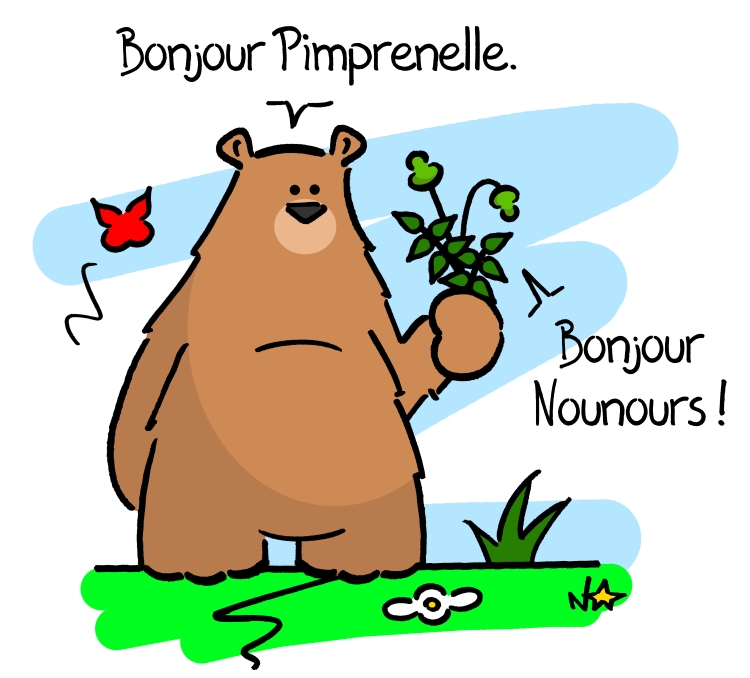Surtout, son seul (pré)nom invoque à table ou au jardin une touche indéniable de poésie. Les plus anciens se souviendront de Nounours et de Pimprenelle, la poupée aux cheveux de laine, héroïne de la série Bonne nuit les petits. D'autre penseront à l'une des trois fées (celle qui porte une robe bleue) dans la Belle au bois dormant. Le calendrier républicain lui rend hommage vers le début du mois de mai, le 17ème jour du mois de Floréal. A l'heure où des prénoms comme Rose, Cerise ou Prune (d'autres Rosacées) ont le vent en poupe, Pimprenelle reste un prénom trop rare, fêté le jour de Sainte Fleur, le 5 octobre (ça ne s'invente pas). Alors si ce prénom est le votre, permettez moi de vous féliciter - considérez-vous comme une espèce protégée - et de vous dédicacer ce modeste article!